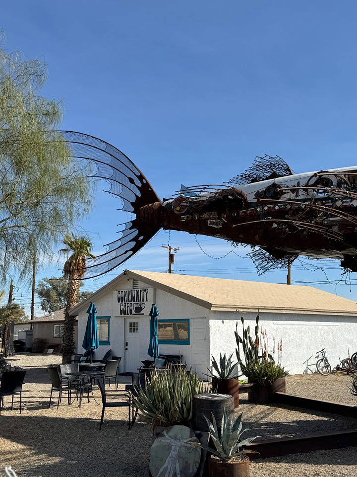 Close proximity made eavesdropping effortless. Their conversation drifted between art, design, and cultural revival, topics that immediately piqued our interest. As we later learned from our waitress, the man at the head of the table, was a well-known hotelier and cultural visionary, personally invested in bringing art, community, and creative energy back to Bombay Beach.
