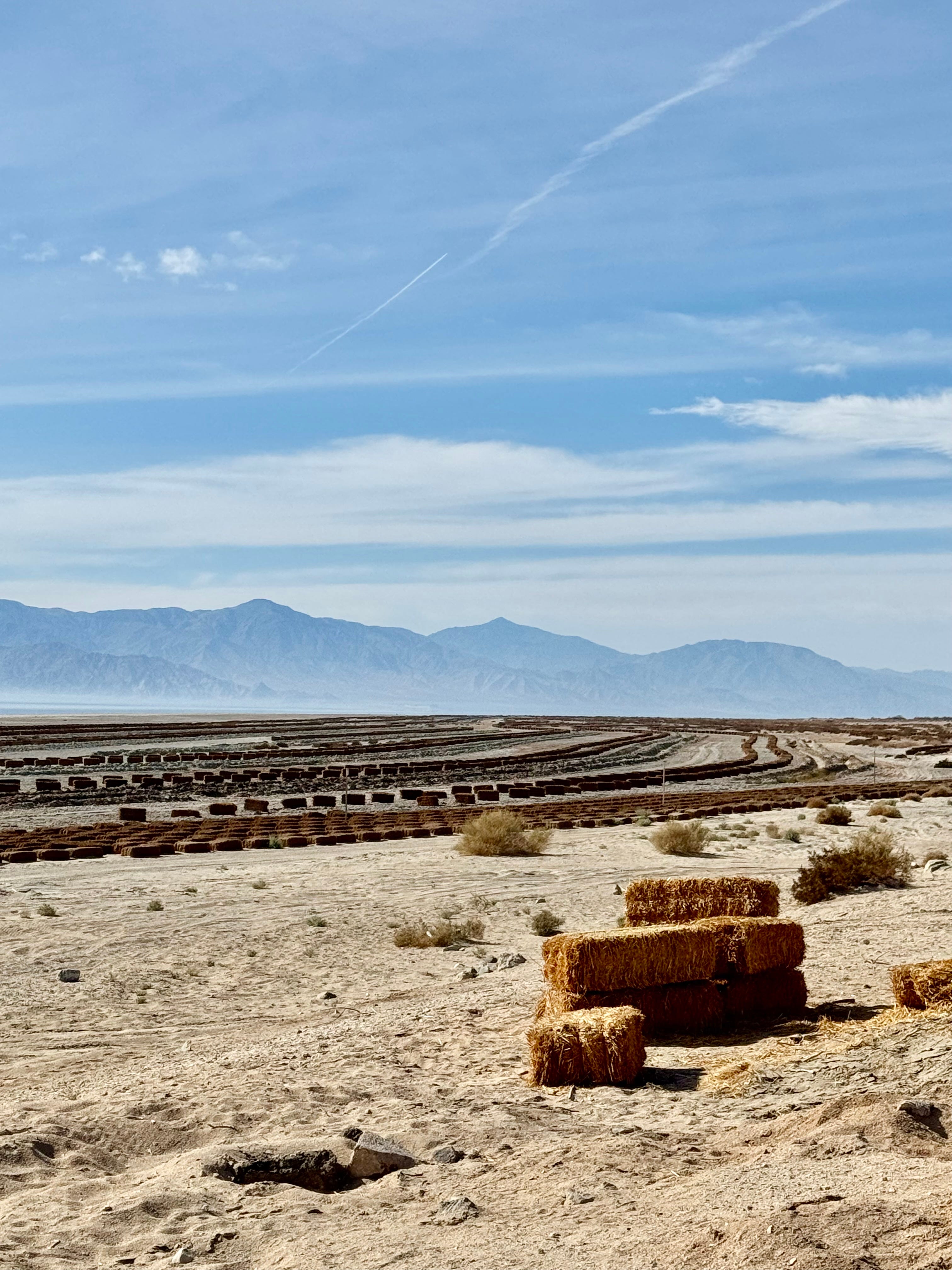 We got back in the car and drove to another location, over yet another berm, only to be met by an astonishing sight: a massive installation of neatly arranged straw bales stretched across the coastline like a geometric patchwork.