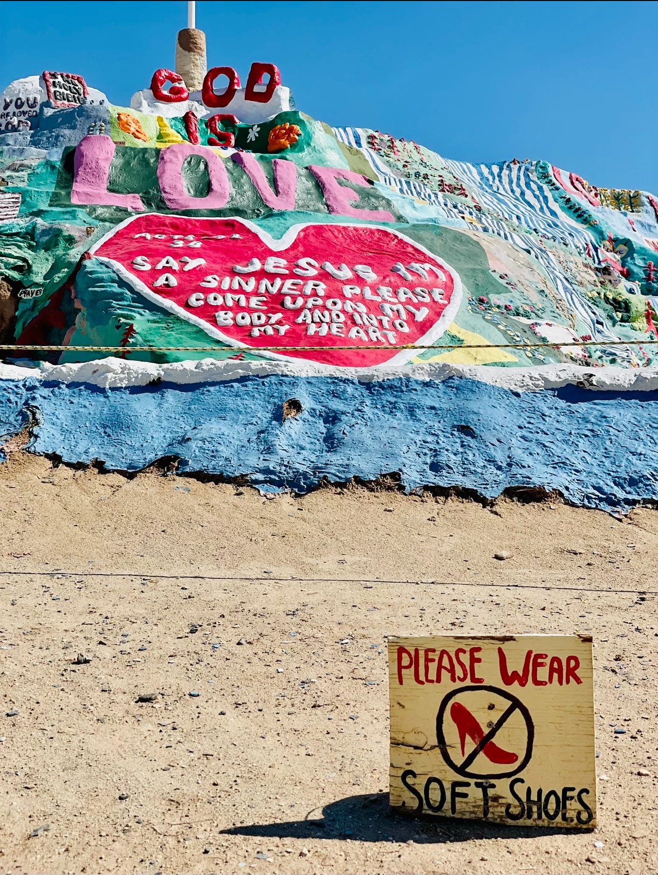Since my first visit to Salvation Mountain three years ago, access to the property has become more readily available. I’ve made several attempts to return for a deeper, more complete experience to share here—but life, as it does, got in the way, preventing my return. Eventually I realized my desire to share this magical place couldn’t wait any longer. Like the mountain itself, this post may be incomplete in its fullest representation—but the incompleteness leaves room for your own experience, should you ever find yourself standing at the foot of Salvation Mountain.