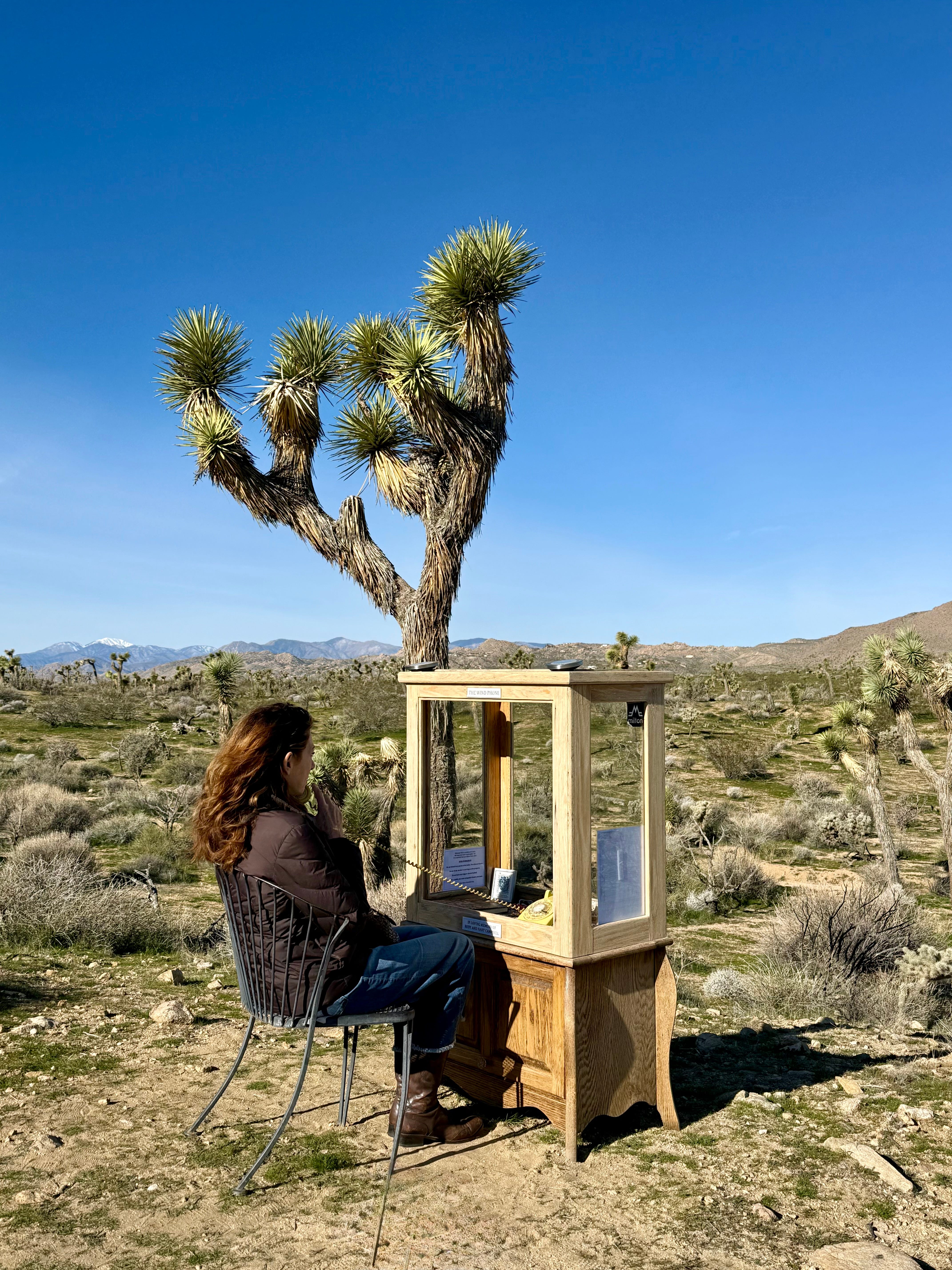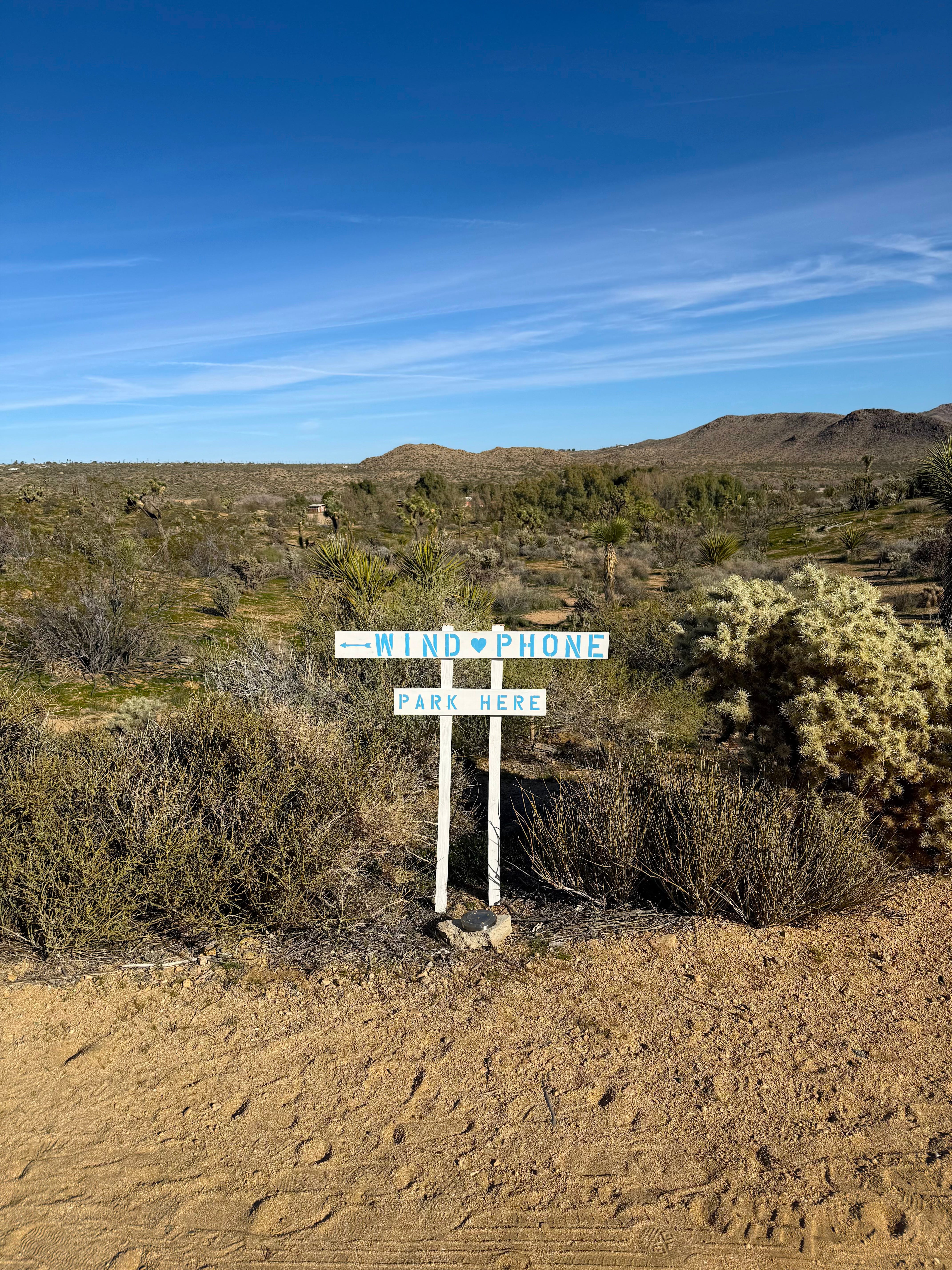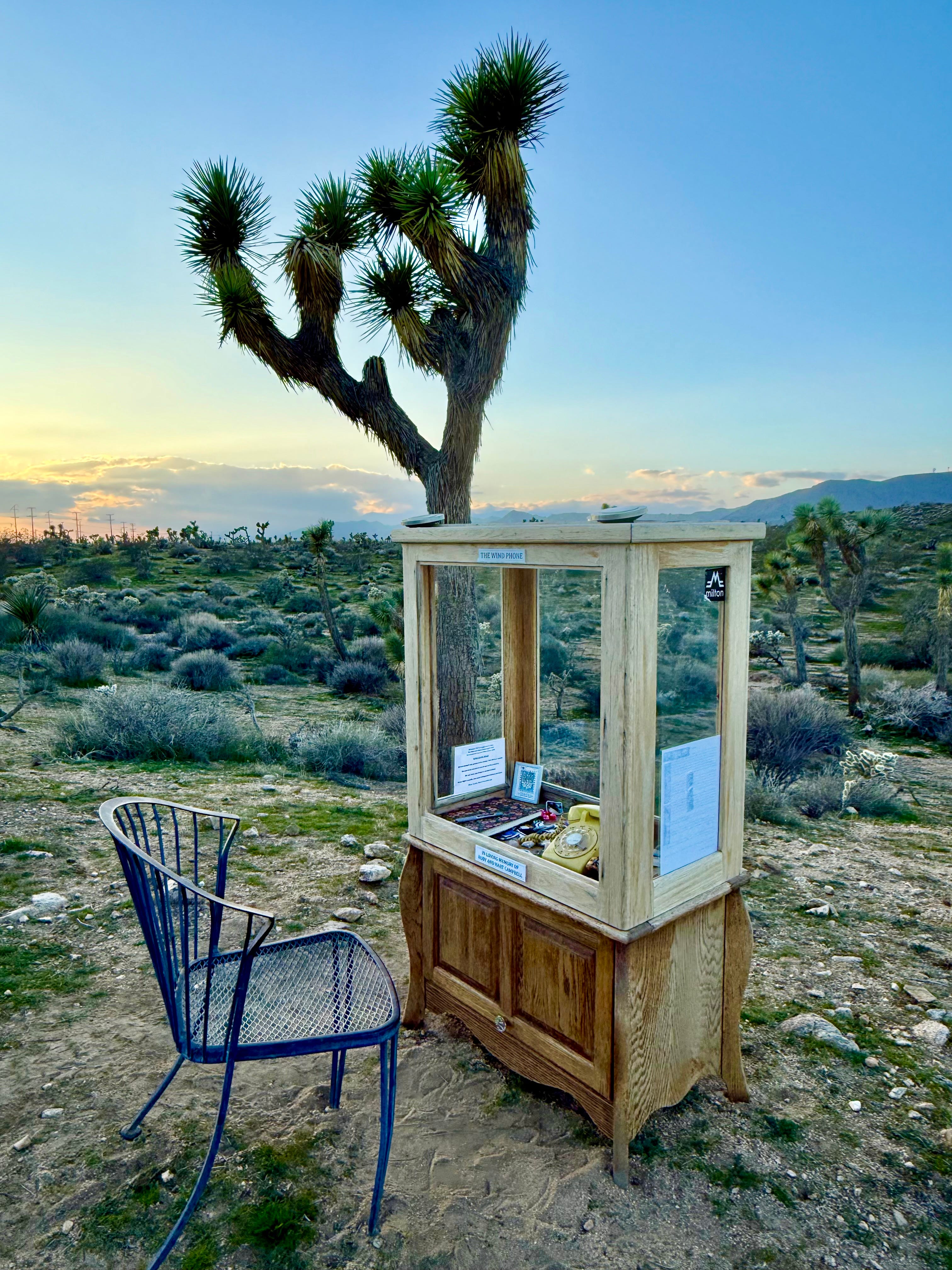 While exploring the property at the Institute for Mentalphysics / Joshua Tree Retreat Center, my friend Suné and I stumbled upon a hand-crafted sign staked into the desert sand. Whitewashed with blue lettering, it simply read: “Wind Phone” - centered by a painted heart, and an arrow pointing us in its direction.