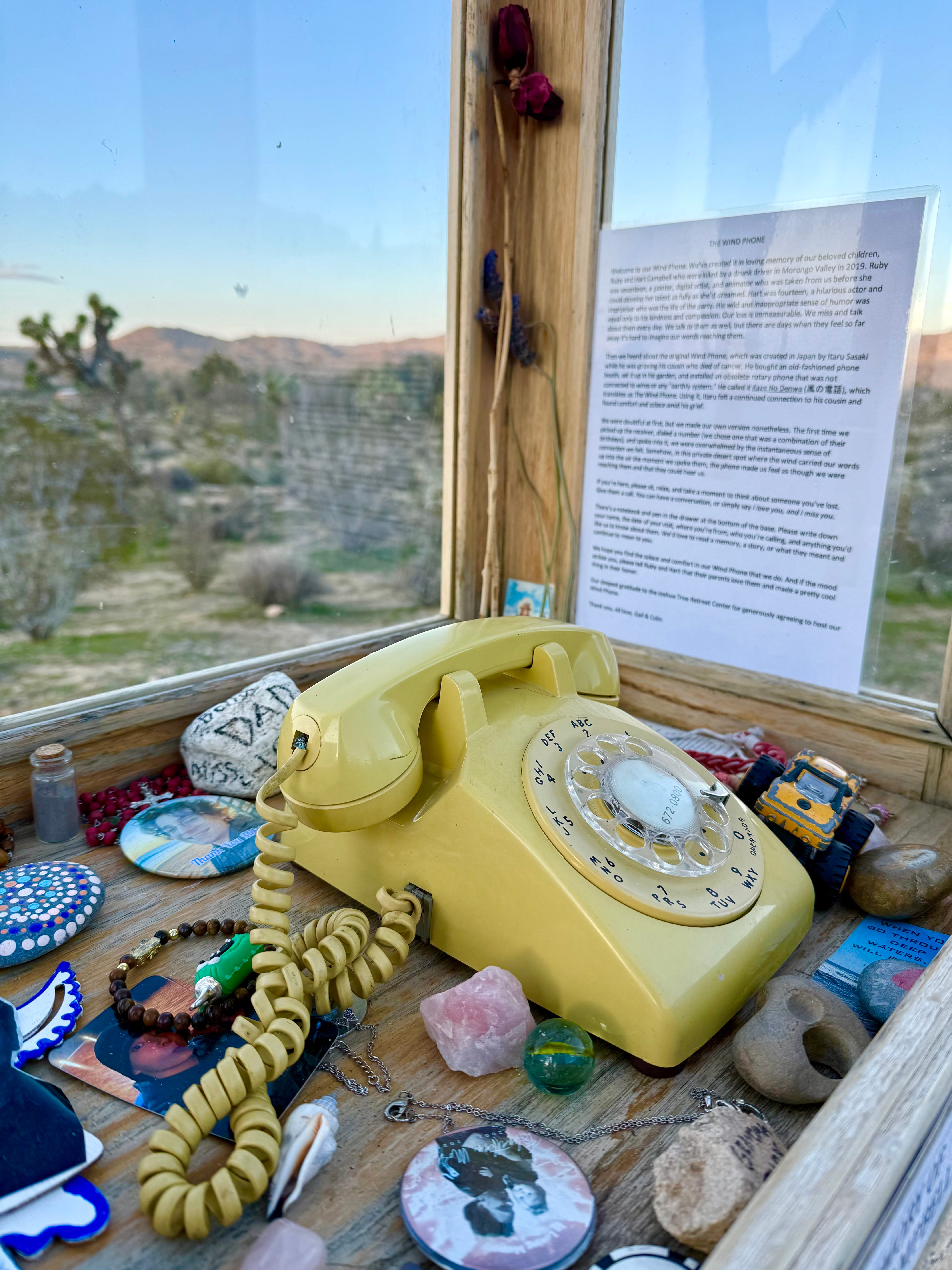 Tucked beside the phone was a laminated letter from its donor, Colin Campbell, describing the Wind Phone’s origin there at the Joshua Tree Retreat Center and its connection to him personally.